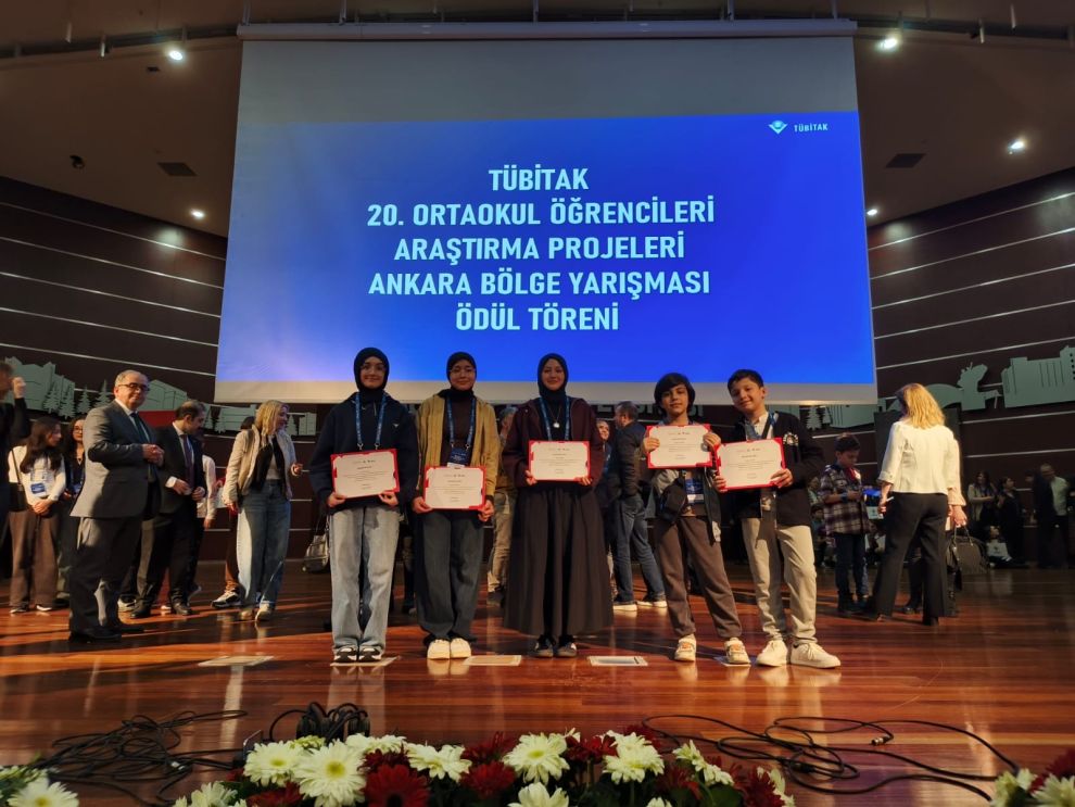 Fen Bilimleri Öğretmeni Serpil Can danışmanlığında hazırlanan “Mantarlardan Elde Edilen Melanin Maddesiyle Radyasyon Kalkanı Oluşturma” adlı proje, özgünlüğü ve bilimsel niteliğiyle jüri üyelerinden tam not aldı. 8. sınıf öğrencileri Elif Tüfekcioğlu, Zeynep Vera Çavuş ve Betül Özdoğan tarafından hazırlanan proje, Ankara Bölge Birincisi olarak Türkiye finallerine katılma hakkı kazandı.
