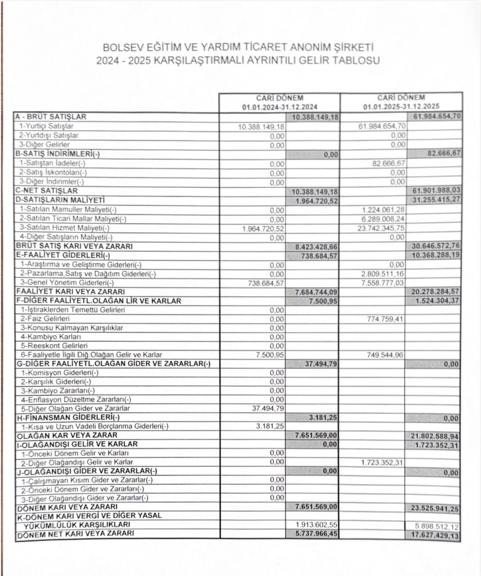 Vakfın açıklamasında, BOLSEV Eğitim ve Yardım Ticaret A.Ş.’nin kuruluşundan bugüne kadar olan gelir ve gider kalemlerinin ticari mevzuata uygun şekilde kayıt altına alındığı belirtildi. Yapılan açıklamaya göre vakıf şirketinin toplam gelirinin 118 milyon 445 bin TL olduğu ifade edildi.