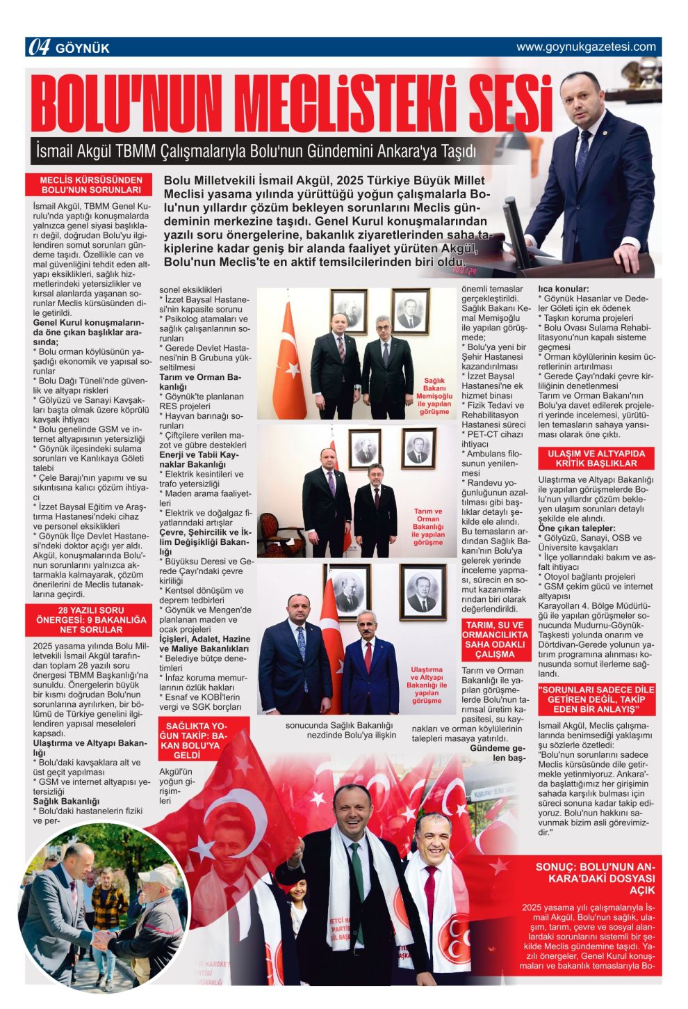 2025 yasama yılı çalışmalarıyla İsmail Akgül, Bolu’nun sağlık, ulaşım, tarım, çevre ve sosyal alanlardaki sorunlarını sistemli bir şekilde Meclis gündemine taşıdı. Yazılı önergeler, Genel Kurul konuşmaları ve bakanlık temaslarıyla Bolu’nun dosyası Ankara’da açık tutulmaya devam ediyor.