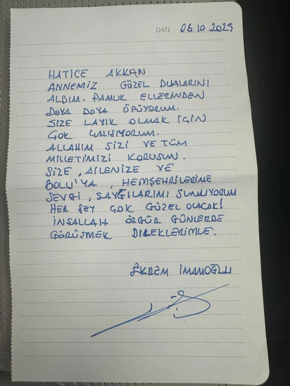 Bolu’da yaşayan Hatice Akkan, Bolu mitingine katılarak Cumhurbaşkanı Adayı Ekrem İmamoğlu’na destek ve dualarını iletmişti. CHP Bolu Milletvekili Türker Ateş aracılığıyla Akkan’a, İmamoğlu’nun cezaevinden kaleme aldığı mektup ulaştırıldı.