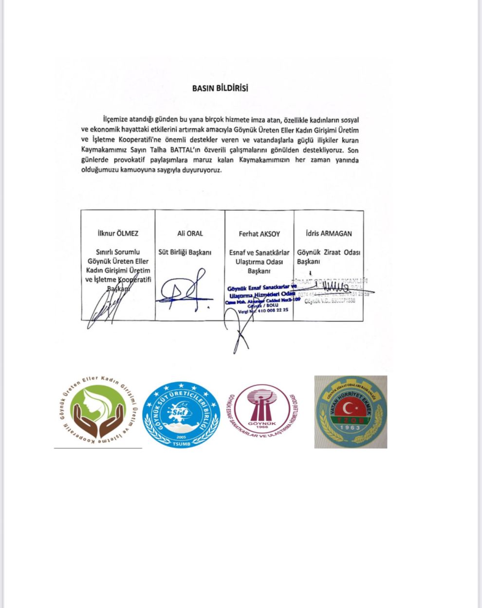 Göynük Üreten Eller Kadın Girişimi Üretim ve İşletme Kooperatifi Başkanı İlknur Ölmez, Süt Birliği Başkanı Ali Oral, Esnaf ve Sanatkârlar Ulaştırma Odası Başkanı Ferhat Aksoy ile Göynük Ziraat Odası Başkanı İdris Armağan, Kaymakam Battal’ın Göynük’te yaptığı hizmetlerin önemine dikkat çekerek, provokatif paylaşımlara karşı Kaymakam’ın yanında olduklarını kamuoyuna duyurdu.