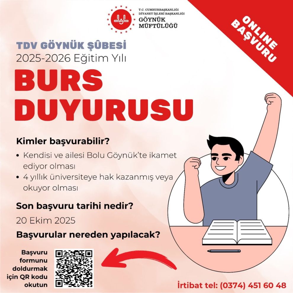 Türkiye Diyanet Vakfı (TDV) Göynük Şubesi, 2025-2026 eğitim öğretim yılı için burs başvurularının başladığını duyurdu.