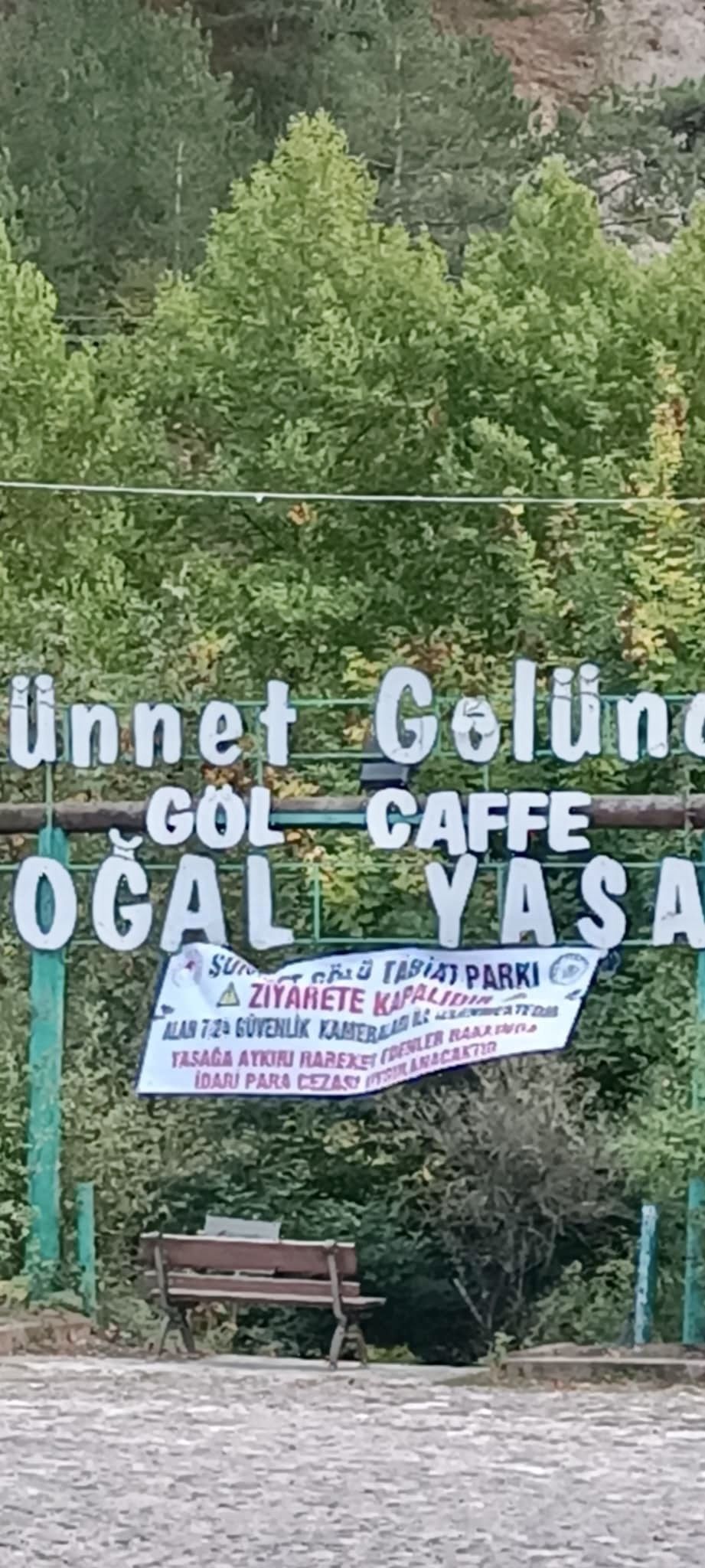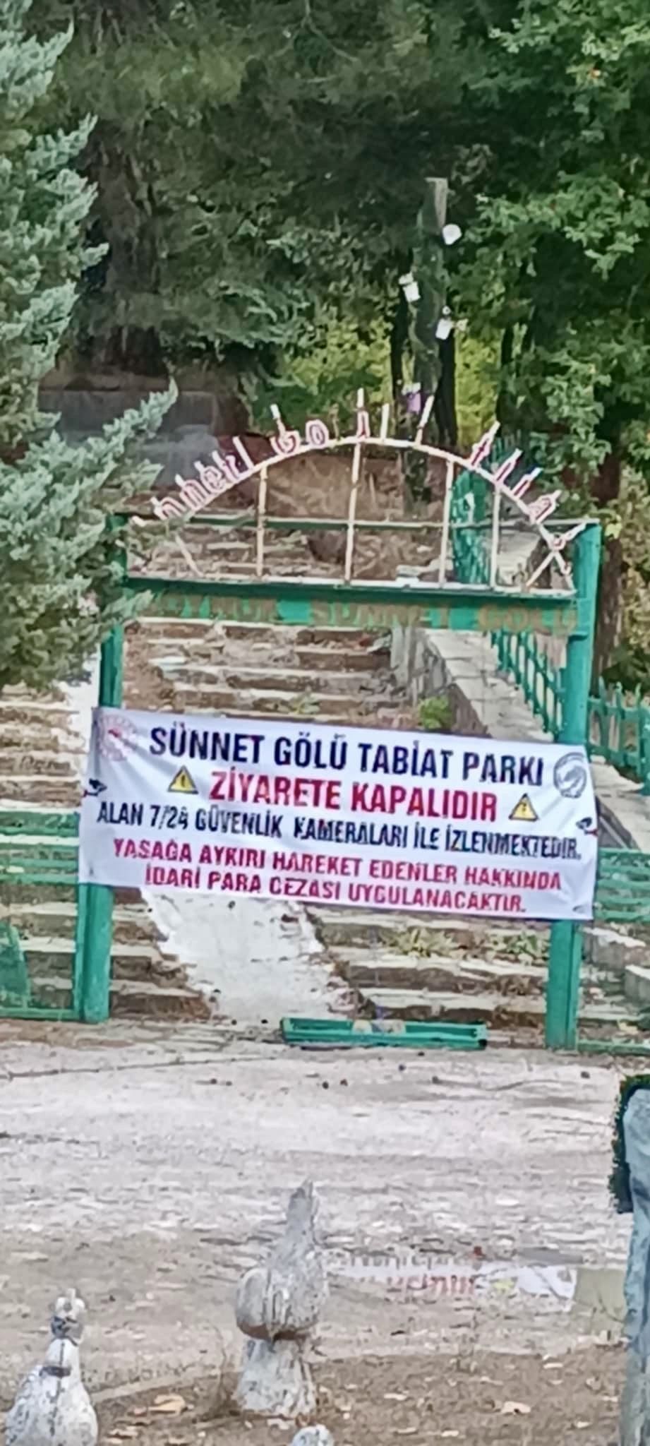 “Sünnet Gölü Tabiat Parkı ziyarete kapalıdır. Alan 7/24 güvenlik kameraları ile izlenmektedir. Yasağa aykırı hareket edenler hakkında idari para cezası uygulanacaktır.”