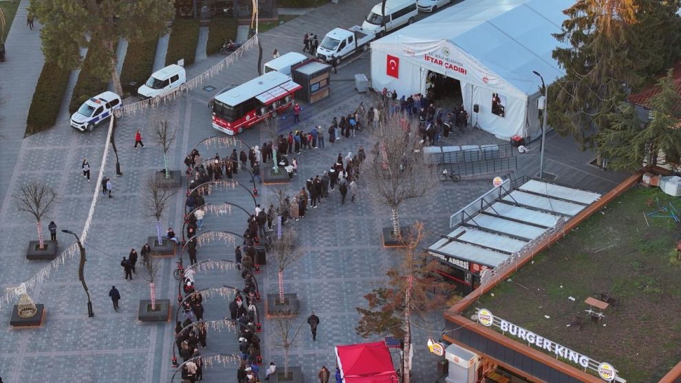 11 ayın sultanı Ramazan’ın ilk gününde Kent Meydanı’nda kurulan iftar çadırı, iftar saatine kısa süre kala uzun kuyruklara sahne oldu. Vatandaşlar; et sote, pilav, çorba, tatlı ve iftariyeliklerden oluşan menüyle oruçlarını açarken, meydanda birlik ve beraberlik tablosu oluştu.